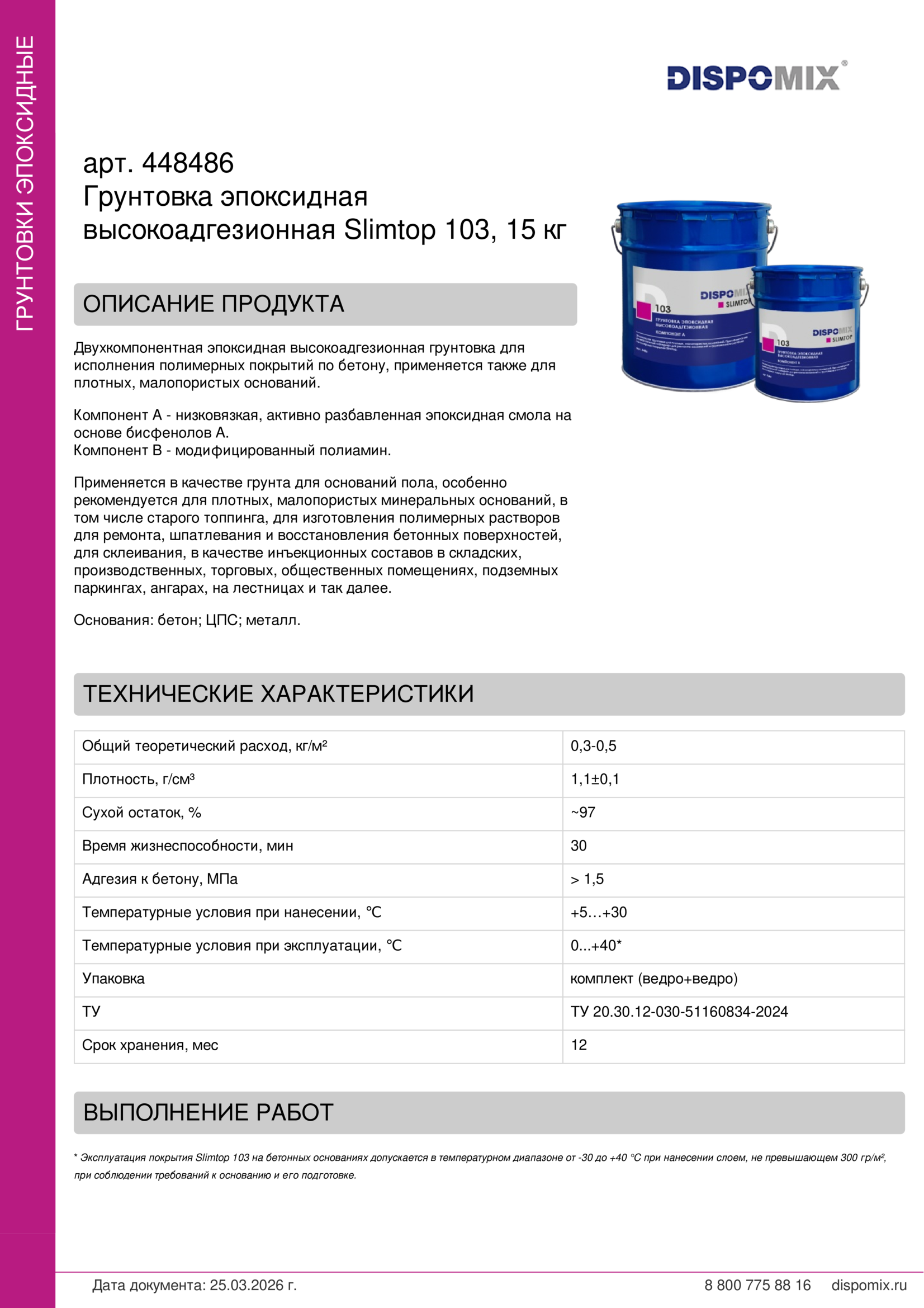 * Эксплуатация покрытия Slimtop 103 на бетонных основаниях допускается в температурном диапазоне от -30 до +40 °C при нанесении слоем, не превышающем 300 гр/м², при соблюдении требований к основанию и его подготовке.