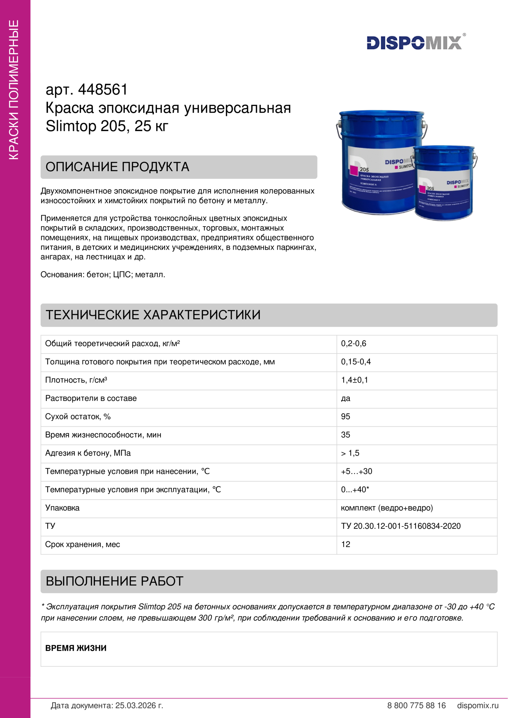 * Эксплуатация покрытия Slimtop 205 на бетонных основаниях допускается в температурном диапазоне от -30 до +40 °C при нанесении слоем, не превышающем 300 гр/м², при соблюдении требований к основанию и его подготовке.