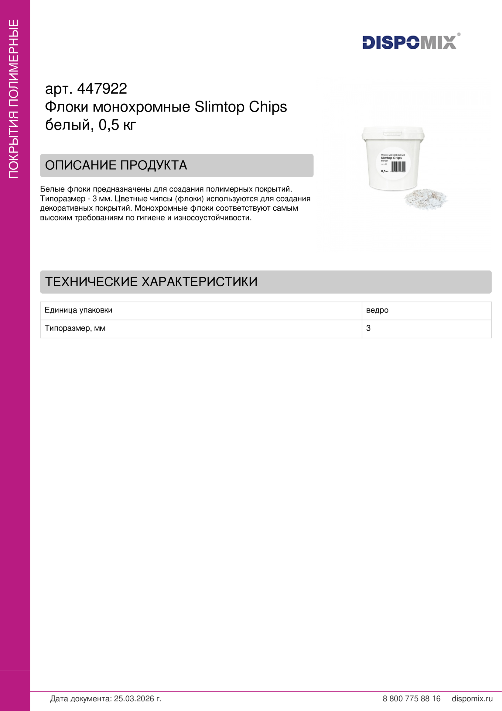 Белые флоки предназначены для создания полимерных покрытий. Типоразмер - 3 мм. Цветные чипсы (флоки) используются для создания декоративных покрытий. Монохромные флоки соответствуют самым высоким требованиям по гигиене и износоустойчивости.