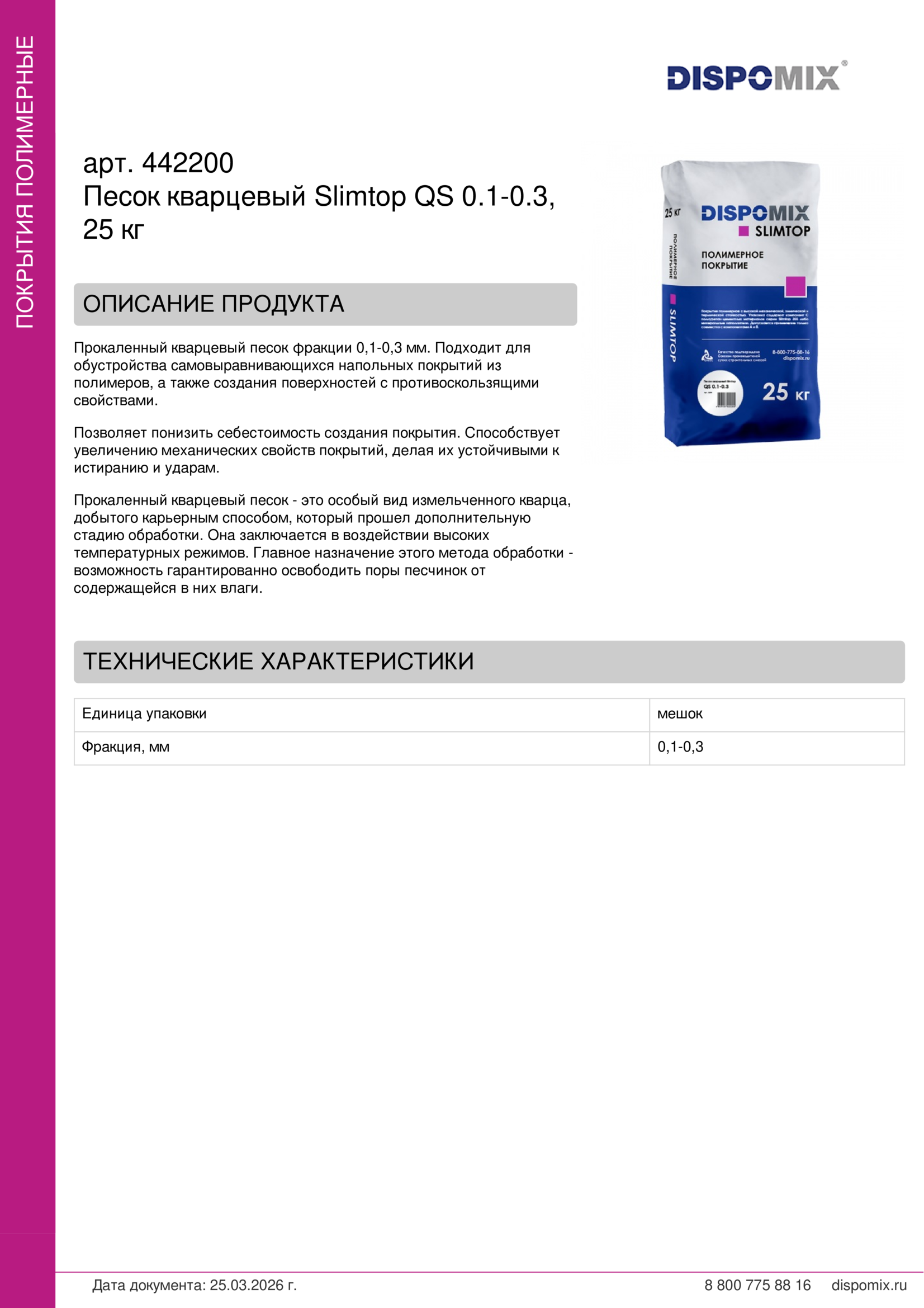 Прокаленный кварцевый песок фракции 0,1-0,3 мм. Подходит для обустройства самовыравнивающихся напольных покрытий из полимеров, а также создания поверхностей с противоскользящими свойствами.