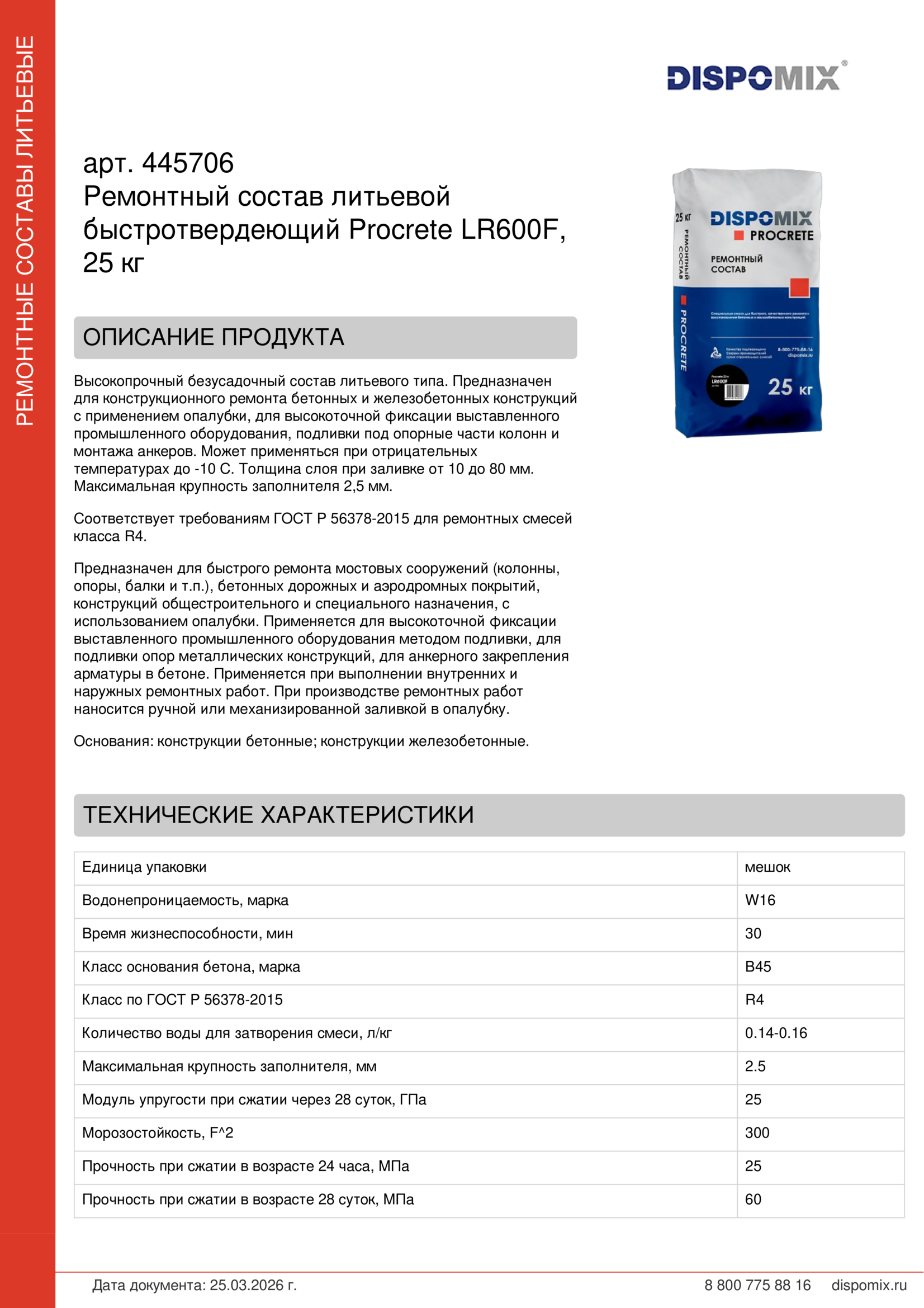 PROCRETE LR600F поставляется в прочных крафт-мешках с полиэтиленовым вкладышем. Срок хранения в сухом помещении и плотно закрытой заводской упаковке составляет 12 месяцев с даты изготовления. Не допускать попадания влаги и в первую очередь использовать уже вскрытую упаковку.