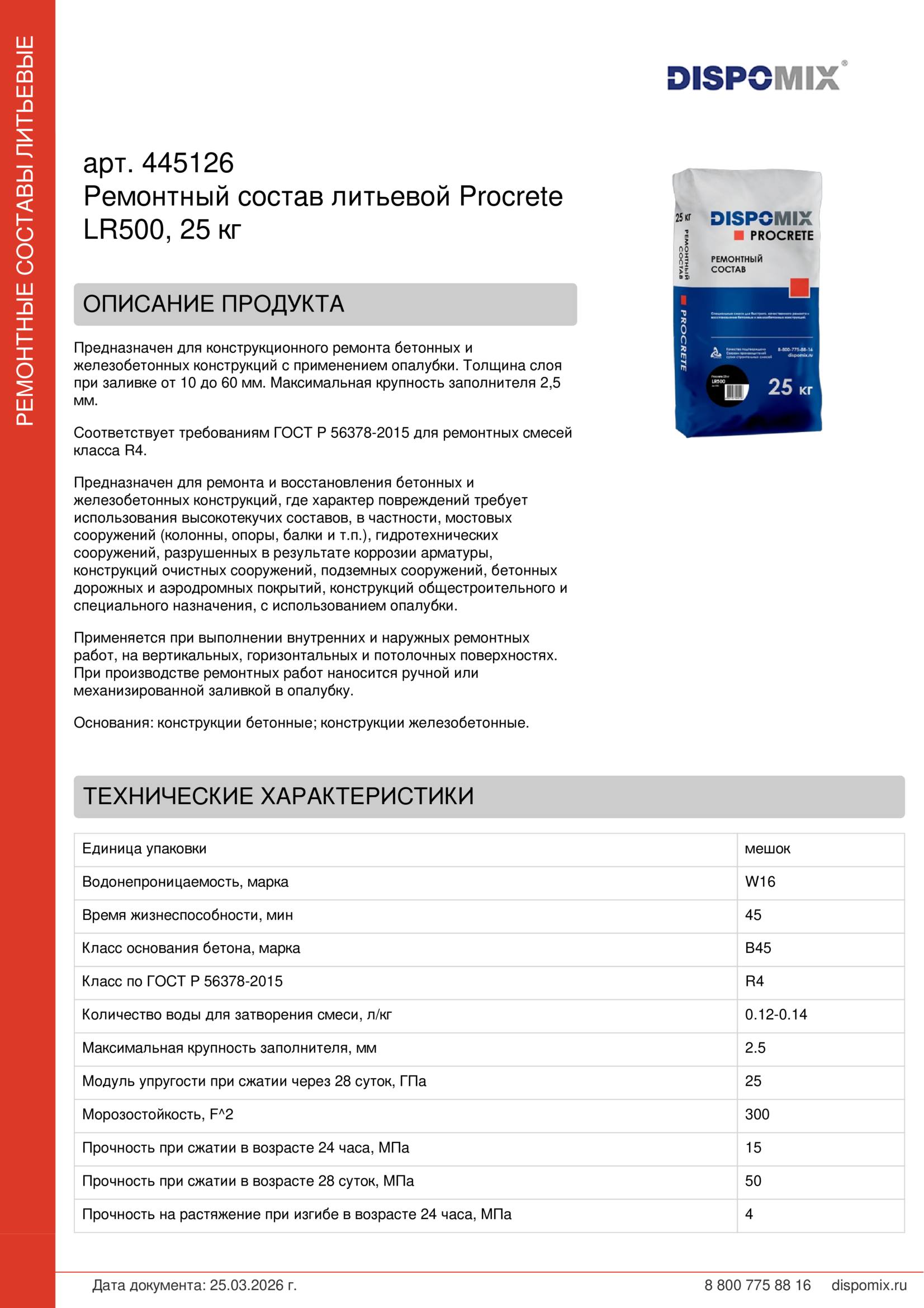 PROCRETE LR500 поставляется в прочных крафт-мешках с полиэтиленовым вкладышем. Срок хранения в сухом помещении и плотно закрытой заводской упаковке составляет 12 месяцев с даты изготовления. Не допускать попадания влаги и в первую очередь использовать уже вскрытую упаковку.