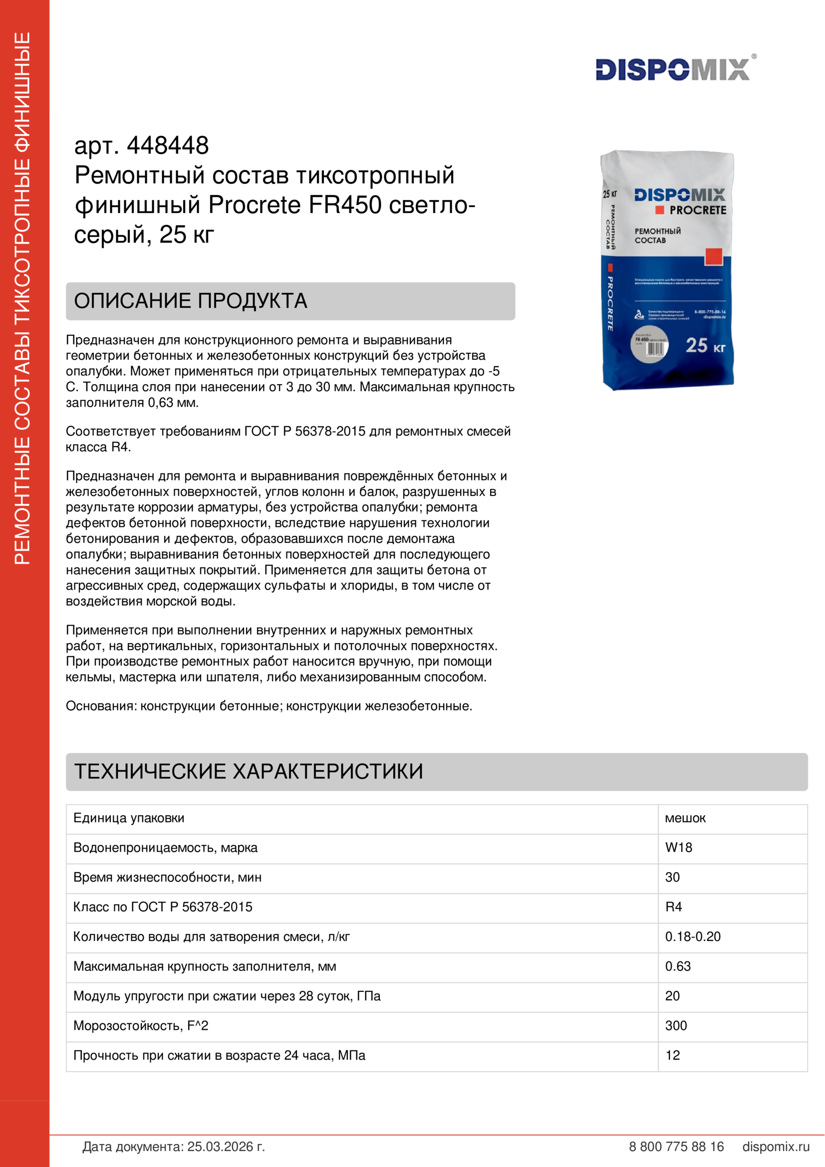 PROCRETE FR450 поставляется в прочных крафт-мешках с полиэтиленовым вкладышем. Срок хранения в сухом помещении и плотно закрытой заводской упаковке составляет 12 месяцев с даты изготовления. Не допускать попадания влаги и в первую очередь использовать уже вскрытую упаковку.