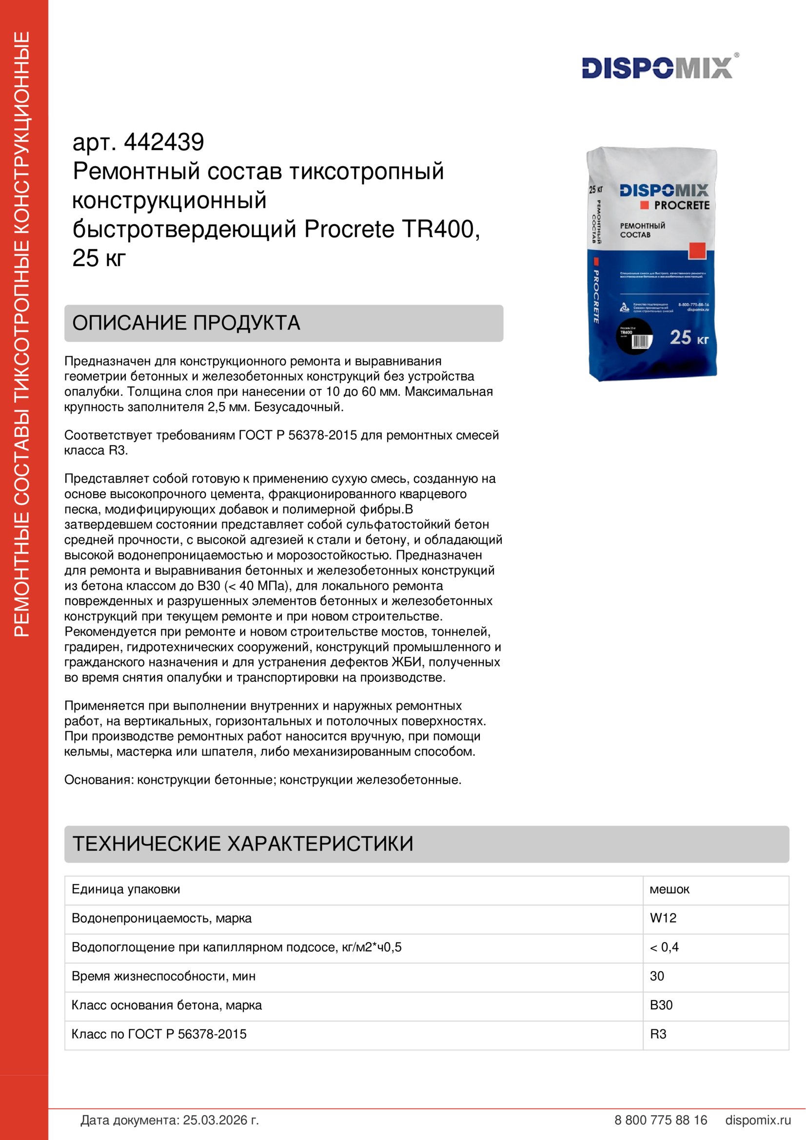 PROCRETE TR400 поставляется в прочных крафт-мешках с полиэтиленовым вкладышем. Срок хранения в сухом помещении и плотно закрытой заводской упаковке составляет 12 месяцев с даты изготовления. Не допускать попадания влаги и в первую очередь использовать уже вскрытую упаковку.