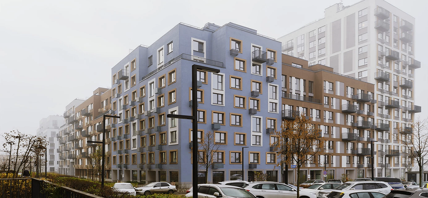 Дизайн и колористические решения каждой секции отличаются. Такой приём в сочетании с разнообразными летними помещениями придаёт фасадам выразительность. Для Дома 5 мы разработали более 50 типов планировок. В том числе одно- и двухуровневые, с отдельным входом, вторым светом, французскими балконами, террасами на первых этажах и крыше, откуда открываются панорамные виды на окружающий застройку природный ландшафт.