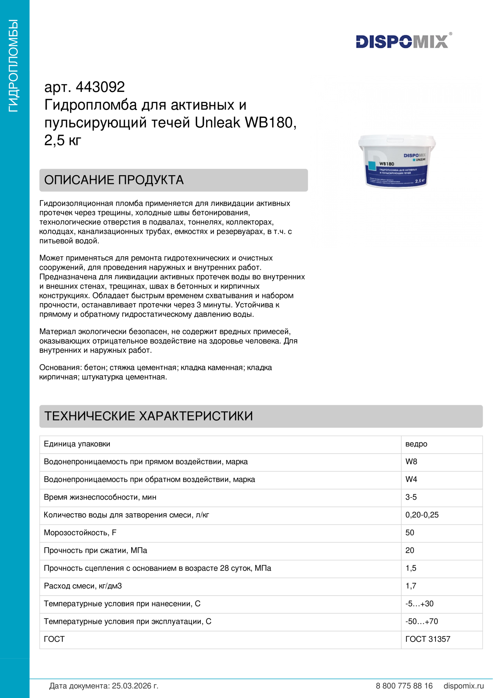 Предназначена для ликвидации активных протечек воды во внутренних и внешних стенах, трещинах, швах в бетонных и кирпичных конструкциях. Обладает быстрым временем схватывания и набором прочности, останавливает протечки через 3 минуты. Устойчива к прямому и обратному гидростатическому давлению воды.