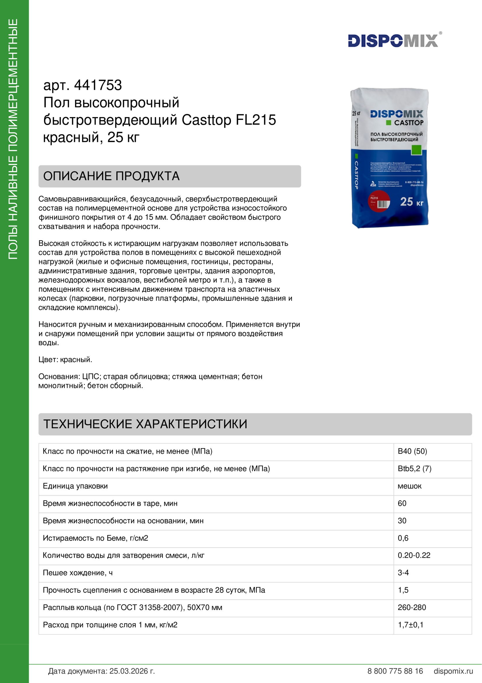 Самовыравнивающийся, безусадочный, сверхбыстротвердеющий состав на полимерцементной основе для устройства износостойкого финишного покрытия от 4 до 15 мм. Обладает свойством быстрого схватывания и набора прочности.
