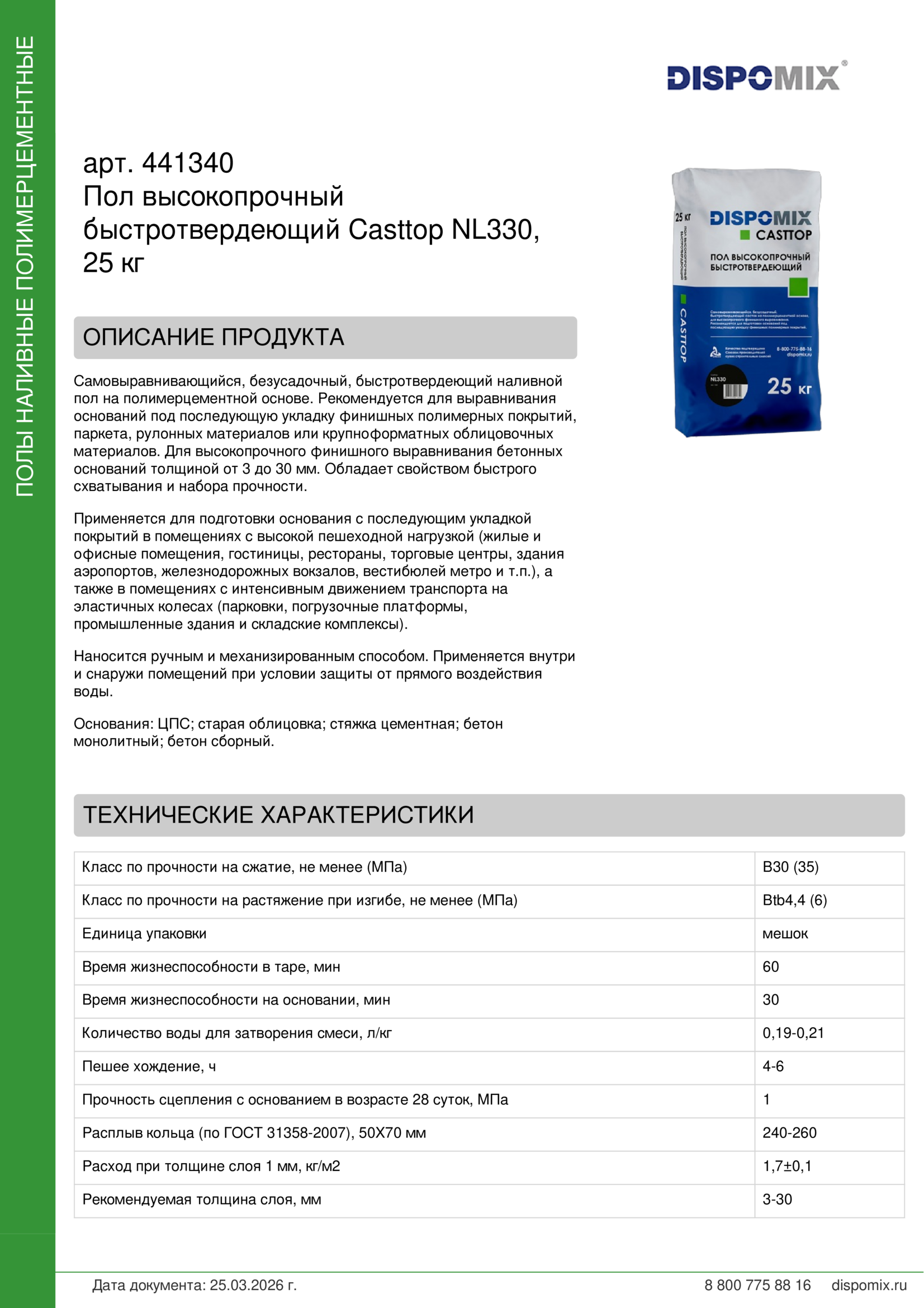 CastTop NL330 поставляется в прочных крафт-мешках по 25 кг. Срок хранения в сухом помещении и плотно закрытой заводской упаковке составляет 12 месяцев с даты изготовления. Не допускать попадания влаги и в первую очередь использовать уже вскрытую упаковку.