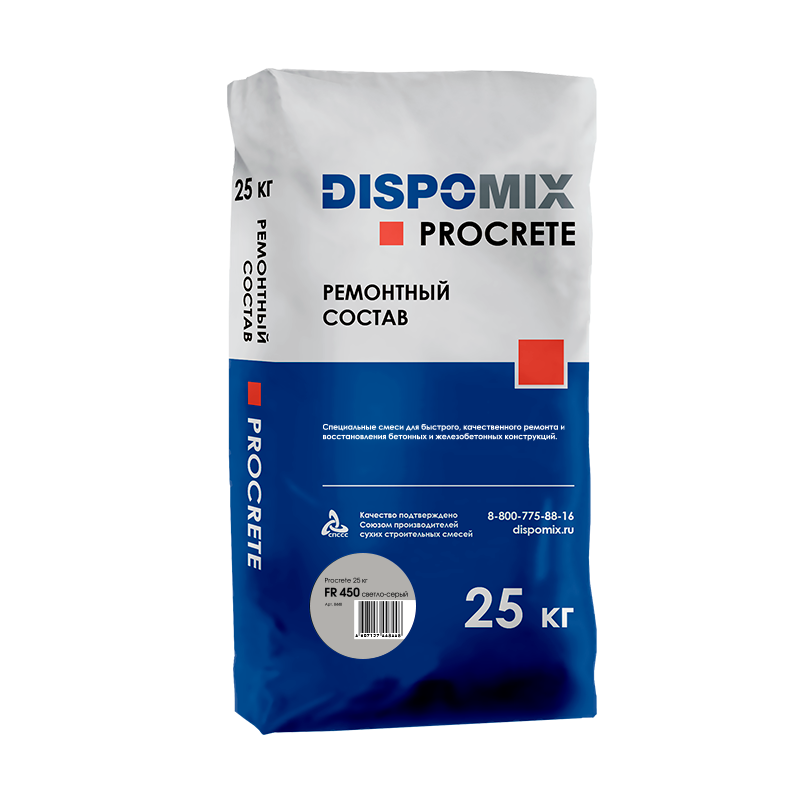 PROCRETE FR450 поставляется в прочных крафт-мешках с полиэтиленовым вкладышем. Срок хранения в сухом помещении и плотно закрытой заводской упаковке составляет 12 месяцев с даты изготовления. Не допускать попадания влаги и в первую очередь использовать уже вскрытую упаковку.