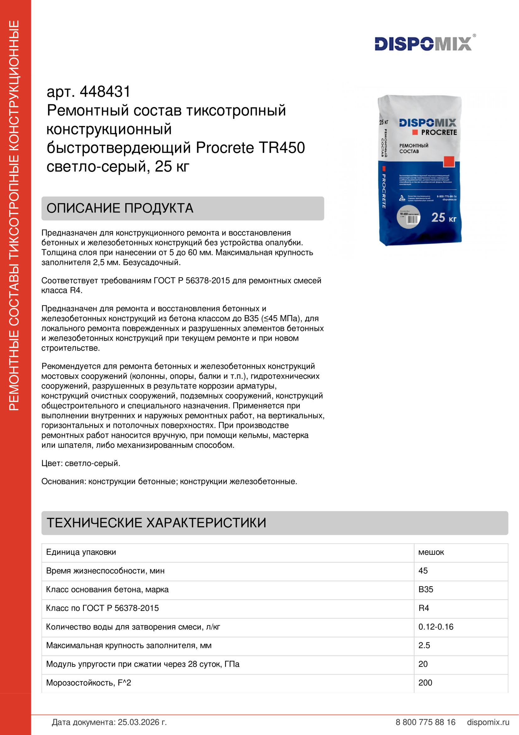 Соответствует требованиям ГОСТ Р 56378-2015 для ремонтных смесей класса R4.