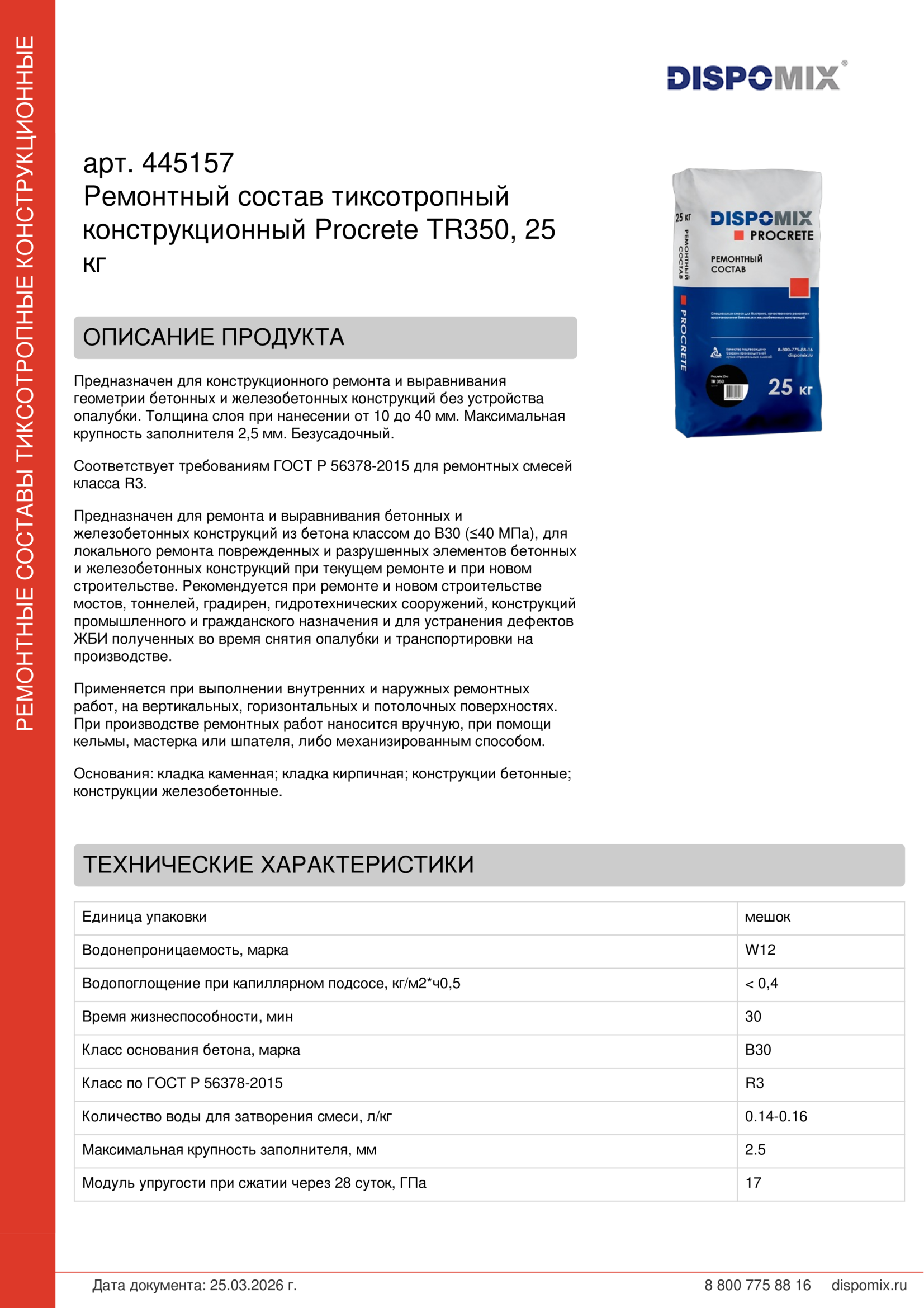 Соответствует требованиям ГОСТ Р 56378-2015 для ремонтных смесей класса R3.