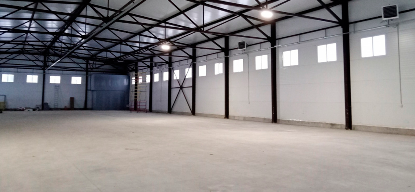 При строительстве склада производились работы по устройству полов из бетона с упрочненным верхним слоем. Использовался износостойкий корундовый топпинг Powertop AF700.