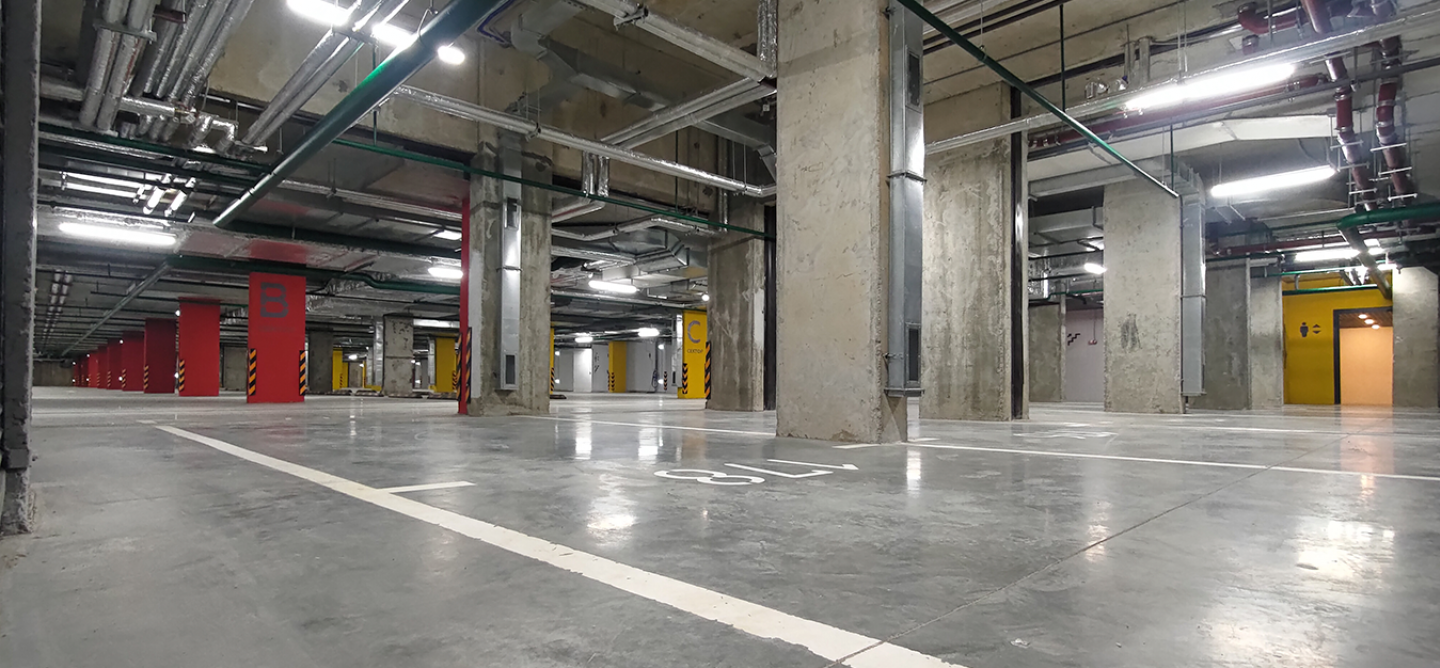 На объекте выполнялись работы по обустройству подземного паркинга с использованием износостойкого корундового покрытия. Площадь работ 4000 м².
